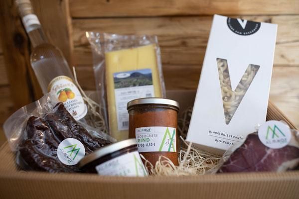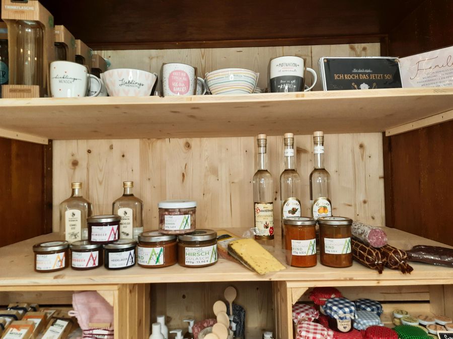 Eigenproduzierte Wurstwaren wie Speck, Salami und Schinken, Marmeladen, Suppen, Gulasch, Bolognese, Nudeln, Fleisch (Tiefgekühlt), Freilandeier, selbstgebackenes Brot und Backwaren von der Bäckerei Alber, Heilmittel nach Hildegard von Bingen, Wein, Spirituosen, Getränke der Postbrauerei und Siebersquelle, Geschenkartikel, uvm.