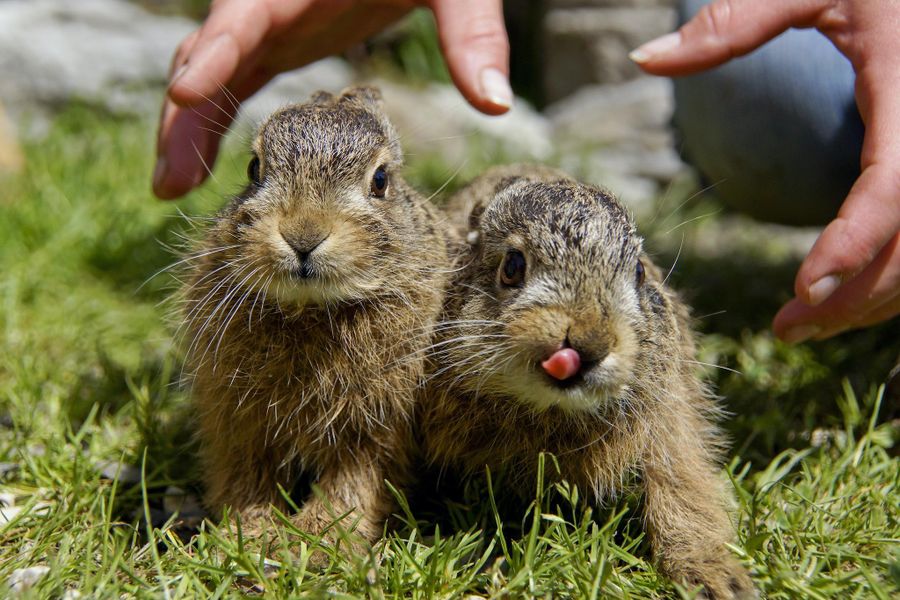 - Eine Nahaufnahme zeigt zwei junge Hasen im Alpenwildpark Obermaiselstein.