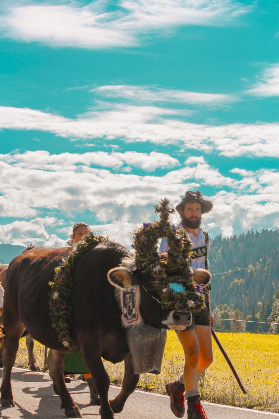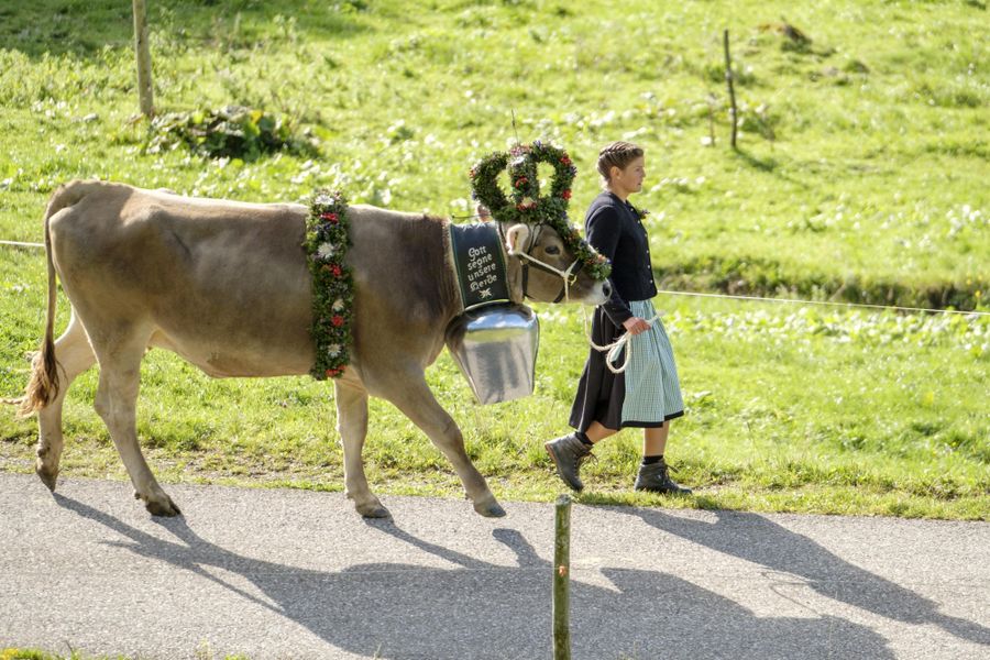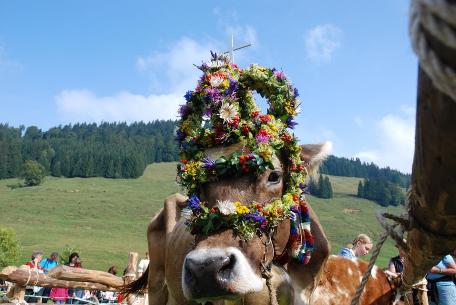 Ein besonderer Blickfang beim Viehscheid ist das sogenannte Kranzrind. Dieses Tier trägt einen aufwendig gestalteten Kopfschmuck aus Naturmaterialien – ein Zeichen dafür, dass der Alpsommer unfallfrei für Mensch und Tier verlaufen ist. Die Gestaltung ist von Alpe zu Alpe unterschiedlich und spiegelt deren individuelle Handschrift wider.