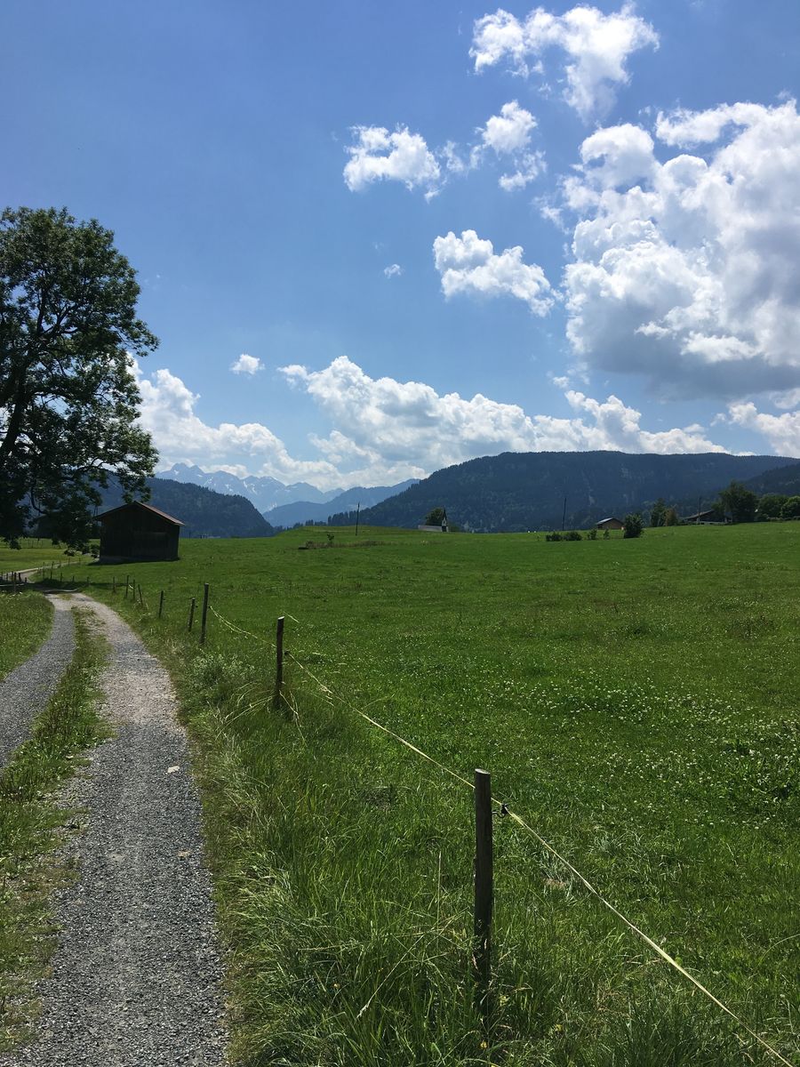Nach dem letzten Haus, etwas oberhalb vom Ort, geht die Straße in einen breiten Wanderweg über. Sofort umfängt Dich die angenehme Stille der Natur - nur noch Vogelgezwitscher und Kuhglockengeläut.