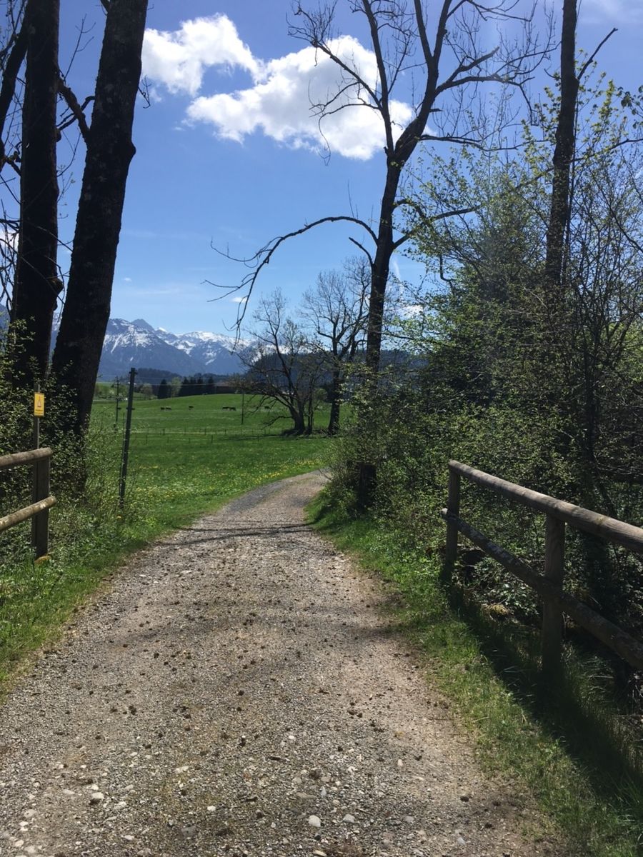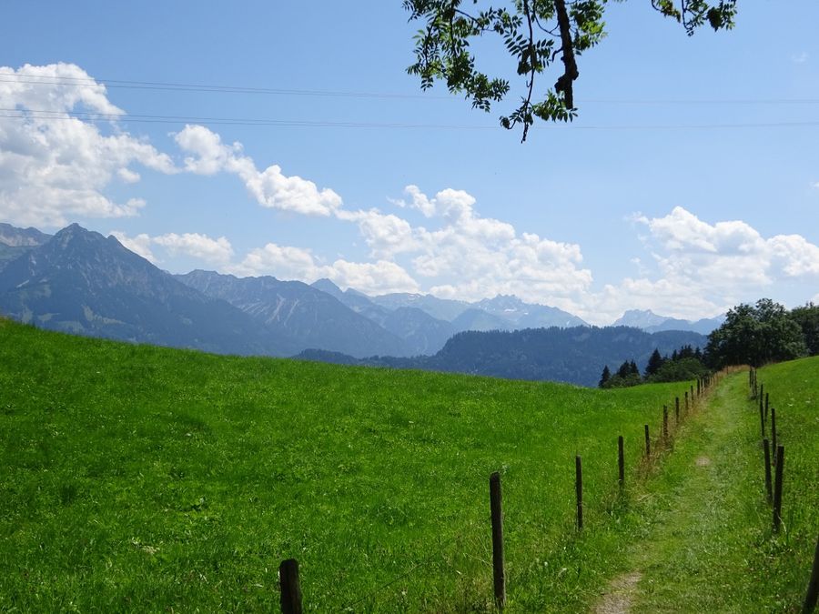 Es beginnt ein einfacher Spazierweg durch die Allgäuer Wiesen, der immer wieder von Ruhebänken mit außergewöhnlichem Panorama gesäumt ist.