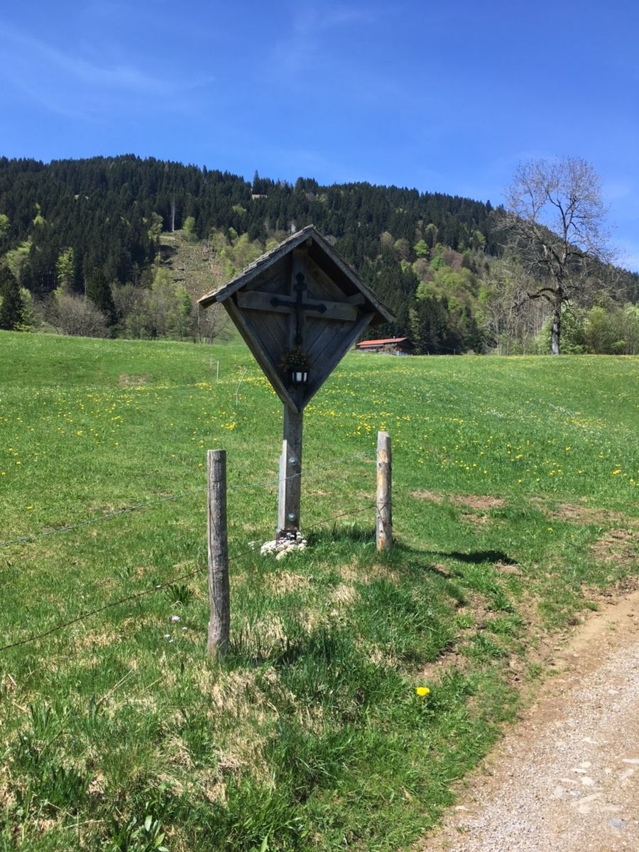 Nach etwa einem Kilometer erreichst Du den Ort Kierwang, wo Du die Hauptstraße überquerst und den Weg Richtung Riedle und Untermühlegg einschlägst.