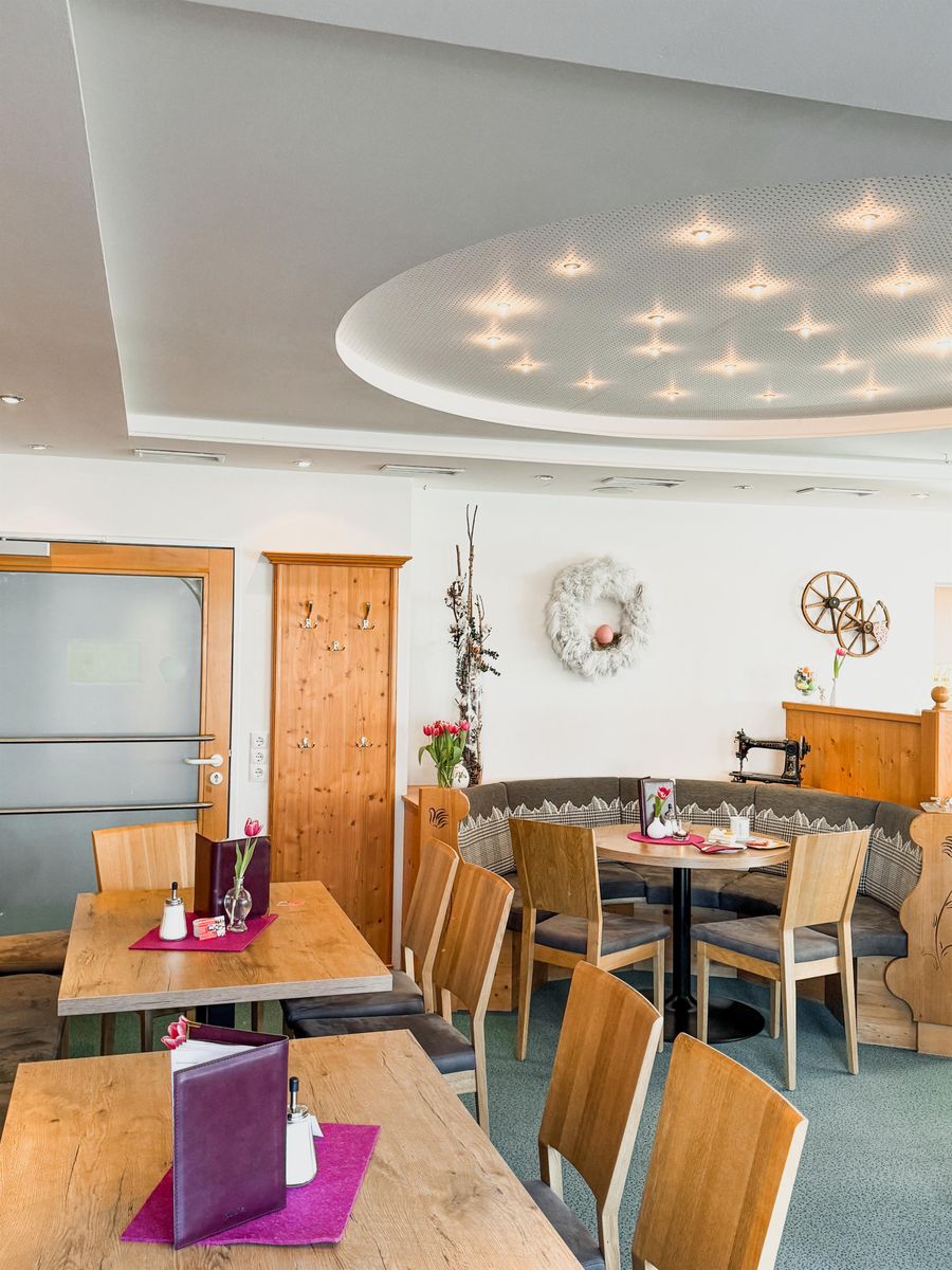 Ob Sie es sich im liebevoll gestalteten, netten Innenbereich gemütlich machen oder die warmen Sonnenstrahlen auf der großzügigen Außenterrasse genießen – das Panorama der Allgäuer Alpen ist Ihr ständiger Begleiter.