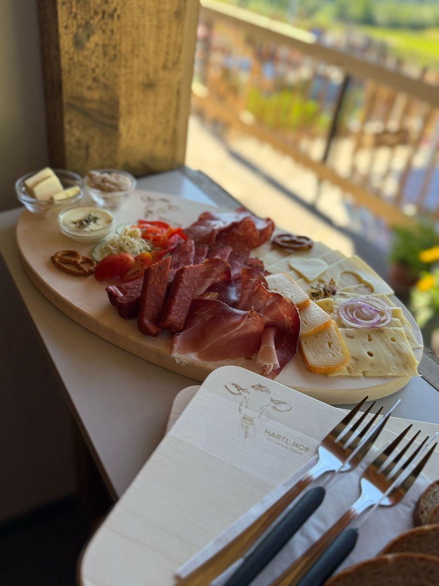 Auf dem HARTL.HOF wartet dein Genussmoment: Eigene Produkte auf der Brotzeit und ein Ausblick, den man nicht vergisst.