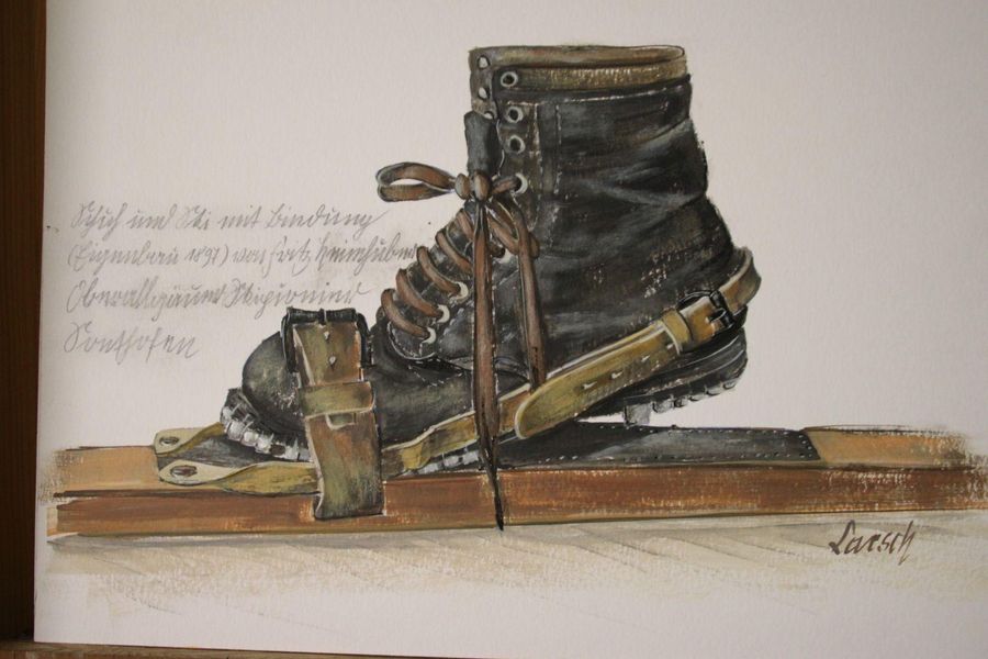 - Zeichnung des ältesten Oberallgäuer Holzski samt Lederschuh und Bindung - im Heimathaus Fischen
