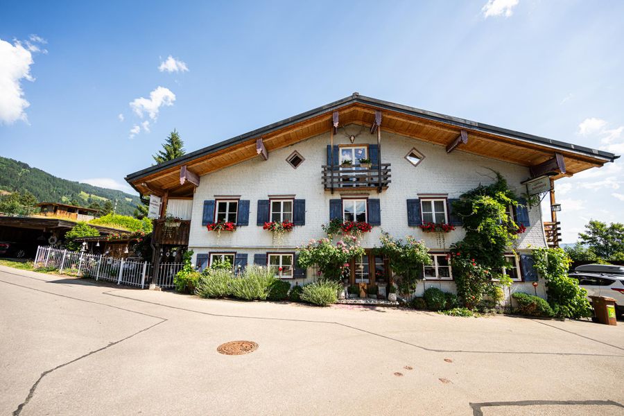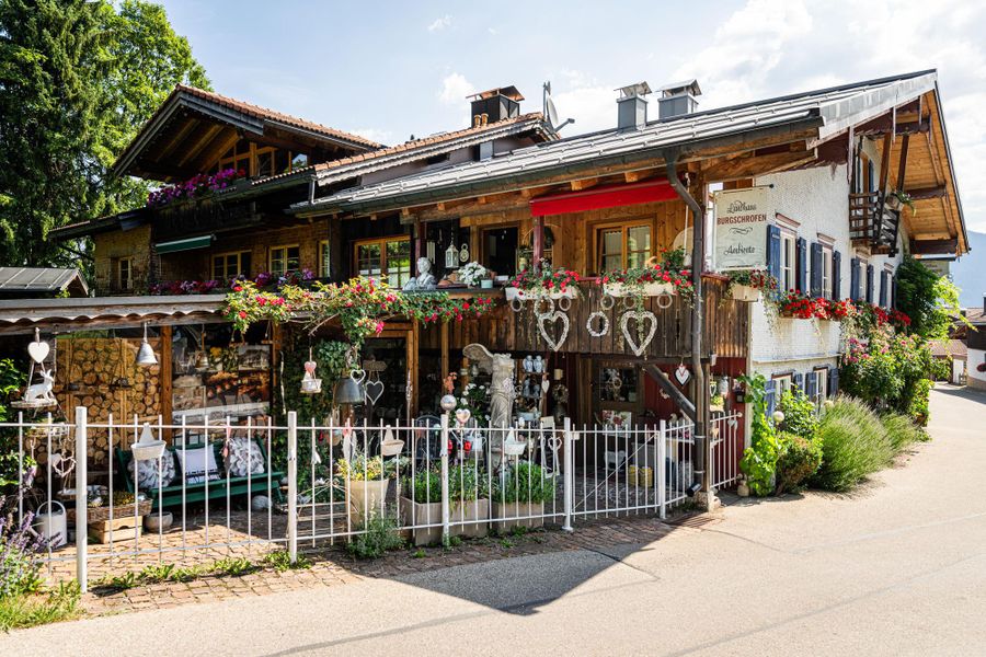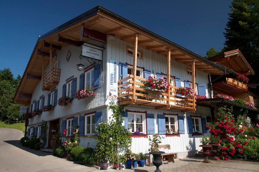 Am oberen Ortsrand von Obermaiselstein, am Fuße des Riedbergpasses, liegt das Landhaus Burgschrofen mit einem Laden für Weine und Wohnaccessoires.