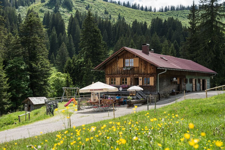 Von der Talstation der Hörnerbahn aus gelangst Du zunächst auf einen Weg, der Dich direkt zu einer der steilsten Rampen im Hörnergebiet führt. Mit einer Steigung von rund 25 Prozent, die Dir volle Kraft und Ausdauer abverlangt, geht es für Dich hinauf zur Sennalpe Ornach und weiter vorbei an der Mittelstation der Hörnerbahn. Oben angekommen mündet der Fahrweg in eine traumhafte Panoramaroute am Grat, auf der Du eine weite Aussicht auf die Allgäuer Alpen und ins Illertal genießt, während Du die Bergstation der Hörnerbahn passierst. Von dort führt Dich ein Fahrweg, zunächst bergab und dann über einen kurzen Anstieg, zum Berghaus Schwaben. Es folgt ein kleiner Geröllweg mit Trail-Passagen, auf dem Du als weniger geübter Mountainbiker vermutlich einige Meter schieben wirst, bevor Du ein weites Grasplateau erreichst. Über eine steile Schotterpiste fährst Du hinunter zum Talschluss, wo an der Oberen Bolgen-Alpe der breite Weg beginnt. Von hier aus geht es für Dich steil bergab zur Alpe Bolgen und weiter vorbei an der Alpe Zunkleiten. Du folgst dem asphaltierten Weg durch das Bolgental, überwindest die Serpentinen im Abstieg und biegst am Ende des Tals links ab. Durch Sonderdorf radelst Du schließlich nordwärts zurück, bis Du wieder den Ortskern erreichst.