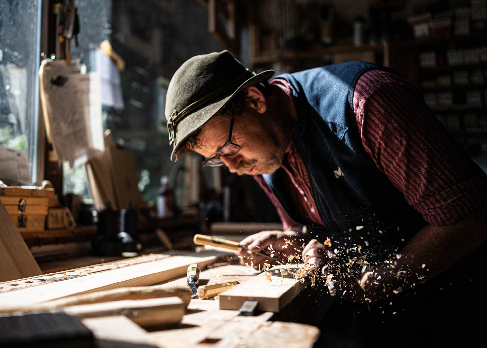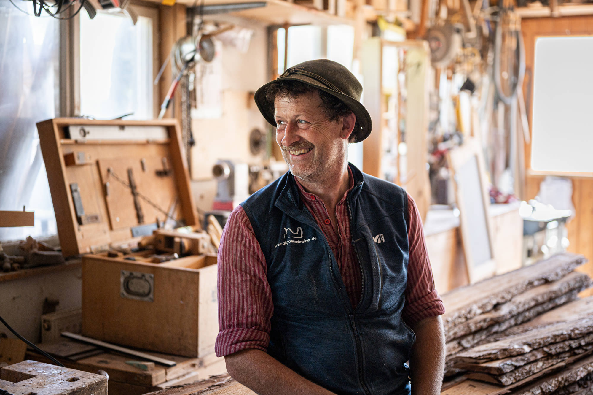 Zwei Worte: „Handwerk“ und „Holz". Nicht aussprechbar, ohne Bilder zu erzeugen. Zunächst das eines Schreiners. Vielleicht das vom alten Gepetto, der an einer Marionette schnitzt, die so gerne ein kleiner Junge wäre. Womöglich das von Josef, dem Zimmermann – dem stillen Schutzheiligen mit Winkelmaß am Gürtel. Ziemlich sicher blitzt auch das Bild von Meister Eder auf, der in seiner Hinterhofwerkstatt mit bayerischer Gemütlichkeit zu Werkzeug oder Bierglas greift. Gern beschleicht einen bei Holz und Handwerk ein nostalgisches Gefühl, das nach alten Zeiten und Weltvergessenheit schmeckt. Bis man den Allgäu-Schreiner kennenlernt.