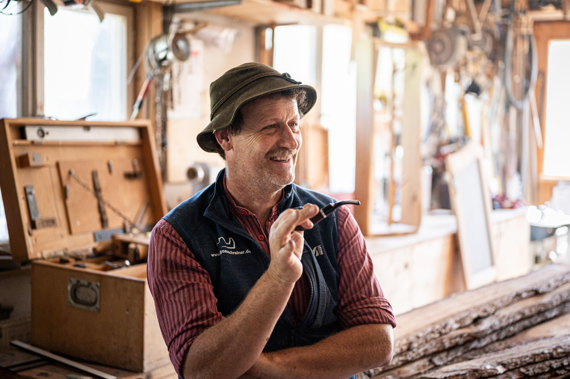 Ein rot-rosa gestreiftes Hemd, Funktionsweste drüber und auf dem Kopf ein weicher Filzhut, der sich im Laufe der Zeit mit den braunen Locken arrangiert hat. Das ist er, der Allgäu-Schreiner. Er heißt Dietmar Martin. Zwischen Jackentasche, Hand und Mundwinkel wandert eine Pfeife – mit langgewohnten Bewegungen geklopft und gestopft, ist sie mal Zeigestab, mal Schläfenkratzer, meist Spielzeug für Hände, die nicht gut stillhalten können. Ab und zu nimmt Dietmar zwei, drei Züge, dann „schmeckt“ man den Rauch eines rassen, unfermentierten Krauts. Sowas raucht einer, der keine Umwege macht, aber auch keine Sperenzchen brauchen kann.