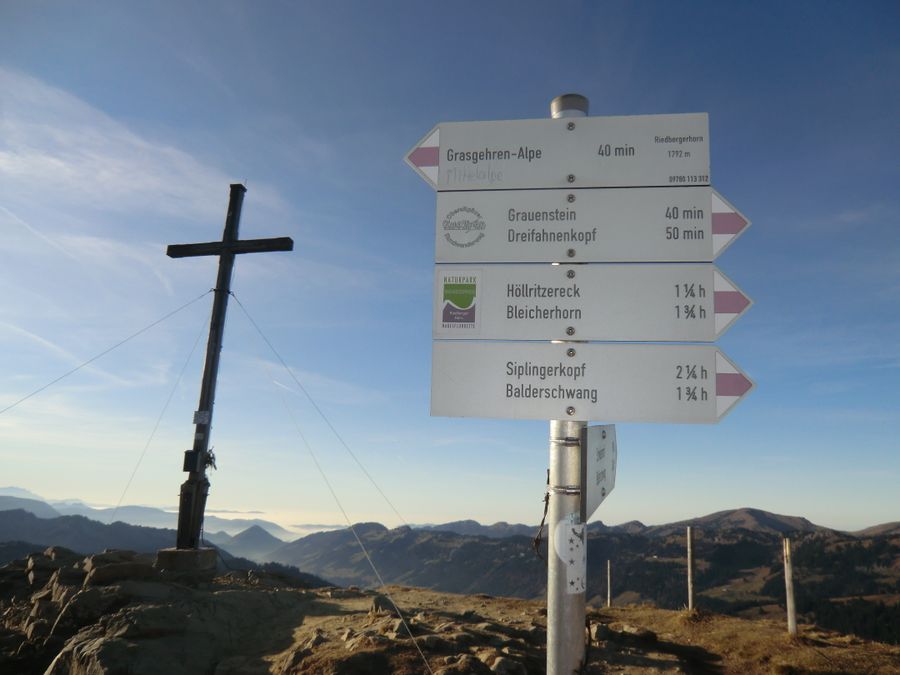 Der gut ausgebaute Bergweg schlängelt sich in Serpentinen hinauf zum Gipfel des Riedbergerhorns (1.787 m). Oben angekommen, eröffnet sich ein fantastisches Panorama auf die Allgäuer Alpen, das Illertal und das benachbarte Balderschwang.