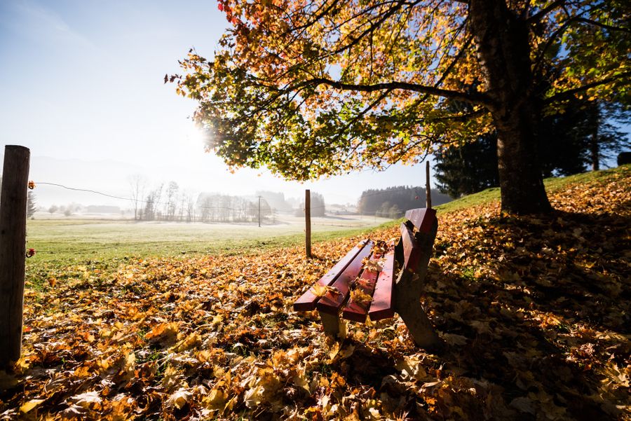 Der Wanderer und Spaziergänger sollte es ihnen gleichtun. Loslassen, das Jahr gemächlich ausklingen lassen, damit die gelassene Stille der herbstlichen Landschaft der Hörnerdörfer auf die Seele wirken kann. Deshalb ist es gut, nicht zu viele Pläne zu machen, sondern dem Tag Raum und Zeit geben. Dann wird die milde Herbstsonne zum besten Zeitmesser, weil sie noch ein Stündchen die Ruhebank vor goldenem Alpenpanorama wärmt, dann werden glänzende Kastanien, die auf verträumte Pfade kullern, zum Wegweiser und nach einem Tag in der klaren, weichen Luft, ist der Duft einer heißen Tasse Kräutertee oder einer dampfenden Schüssel Allgäuer Kässpatzen so viel intensiver. Genussmomente für alle Sinne, jeder Schritt birgt eine Fülle an glanzvollen Eindrücken und doch wird der Kopf entspannter – das vermögen die Hörnerdörfer-Berge im Herbst.