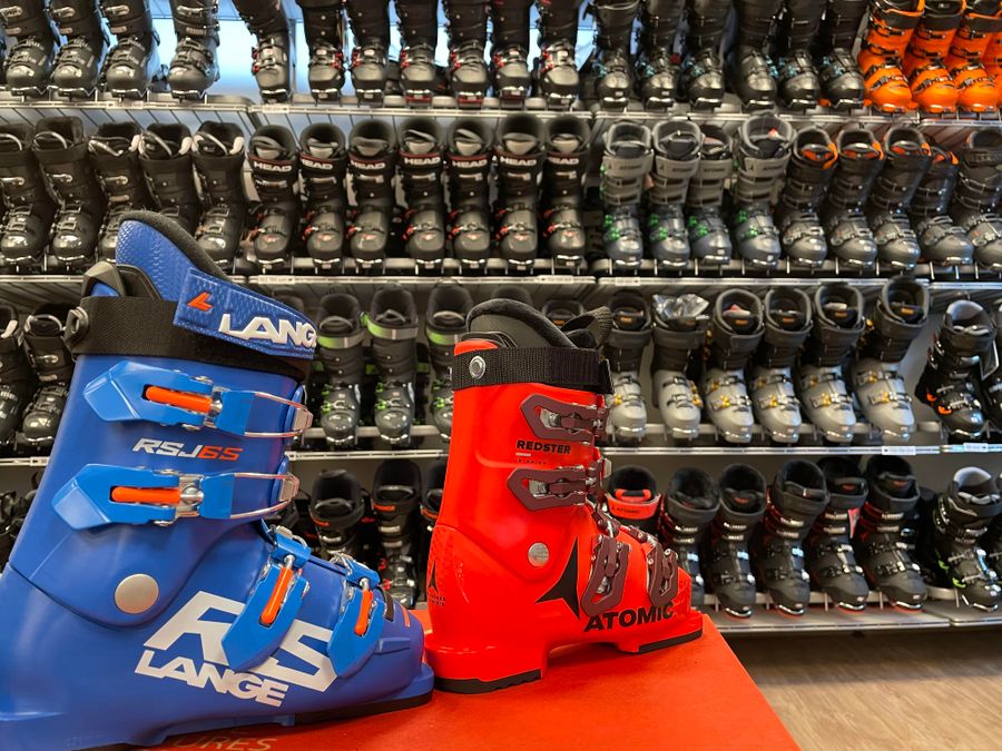 ©Sport Speiser ©Sport Speiser - Regal mit vielen Skischuhen unterschiedlicher Marken und Farben. Im Vordergrund ein blauer Lange RS 165 und ein roter Atomic Redster Skischuh.