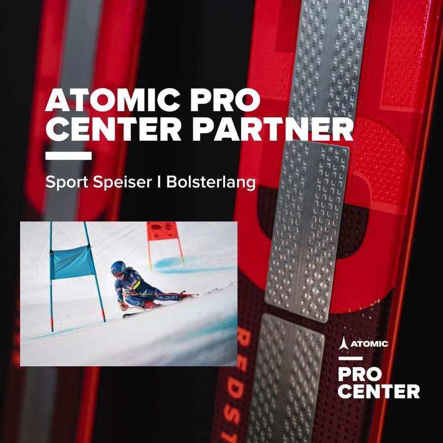 - Werbebild "Atomic Pro Center Partner Sport Speiser Bolsterlang". Skifahrer im Slalomlauf abgebildet. Roter Ski mit "Redster" Schriftzug im Vordergrund.