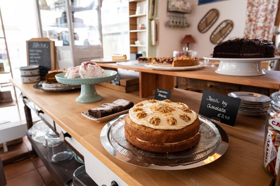 Genieße selbst gebackene Kuchen, Torten, Eis aus Cornwall und Scones mit Clotted Cream in unserem gemütlich-nostalgischen Tagescafé mit Laden im britischen Landhausstil am Dorfanger in Fischen.