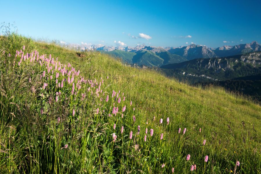 Von Grasgehren aus folgen wir der Beschilderung in Richtung Riedberger Horn. Dabei geht es zunächst auf einer kleinen Teerstraße durch lichte Waldstrukturen bergauf. Ab dem Bolgensattel, welcher einen wunderschönen Ausblick zur Nagelfluhkette und in das Bolgental erlaubt, führt der Weg am Grat entlang zum Gipfel des Riedberger Horns. Dieser ist als besonders schöner Aussichtspunkt mit Weitblick in die Allgäuer Alpen bekannt.
