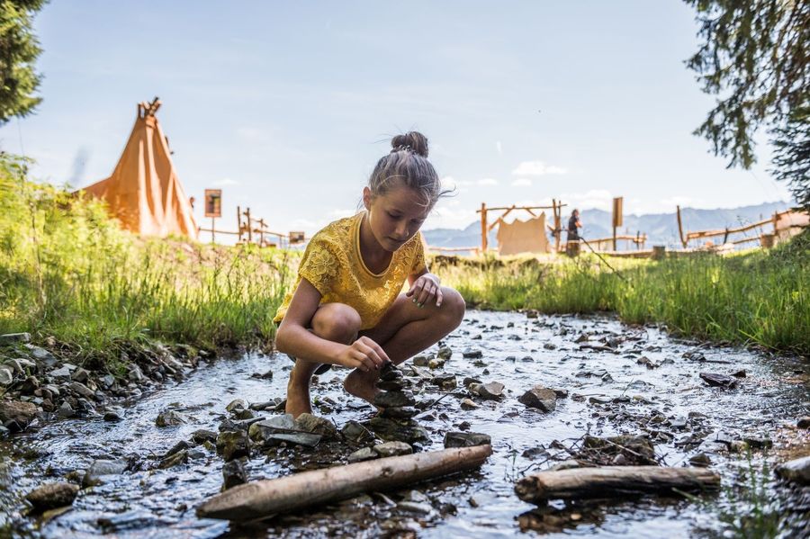 Eine weitere Einkehrmöglichkeit findest Du direkt an der Mittelstation der Hörnerbahn (s'mibbadin). Direkt neben der Mittelstation kannst Du Dein Ziel, das Steinzeitdorf, sehen. Den Rückweg kannst Du entweder bequem mit der Hörnerbahn bewältigen oder den gleichen Weg wieder zurück ins Tal wandern.