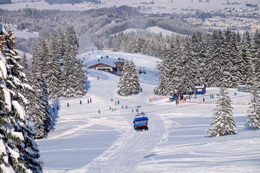 Mit dem Weltcup-Express sind es von der Talstation in Ofterschwang nur wenige Minuten hinauf zum Ofterschwanger Horn. Hier, auf 1.400 Metern, kommen Aktivurlauber ebenso auf ihre Kosten wie Erholungssuchende.