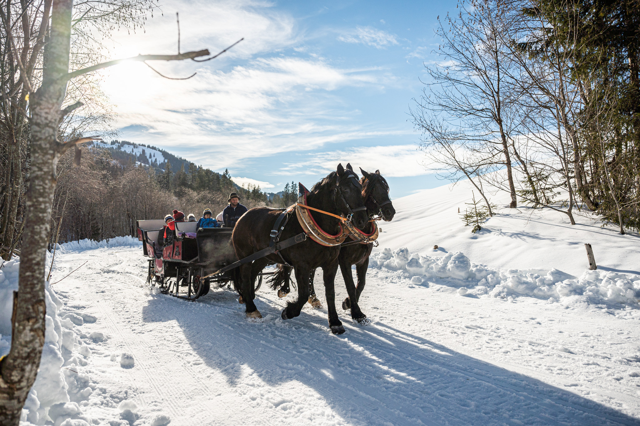 Schneegenuss in tiefster Winterlandschaft vor traumhafter Alpenkulisse - ob beim Schneeschuhwandern, Rodeln oder Kutschfahrten.