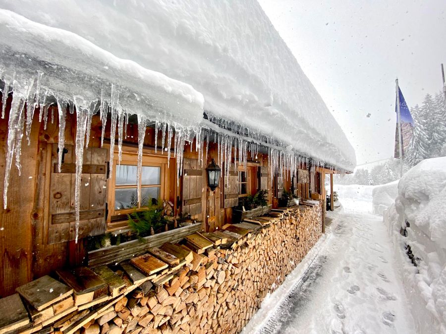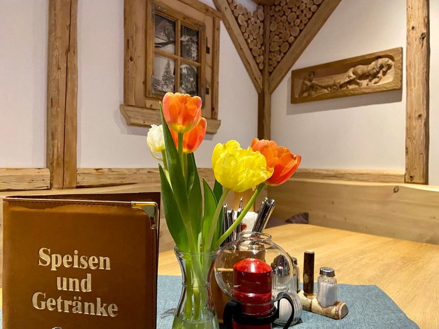Die Lösung findet sich in der gemütlichen Stube mit Kamin: eine große Baumwurzel von der Decke hängend, bildet den Mittelpunkt der urigen Hüttenstube.